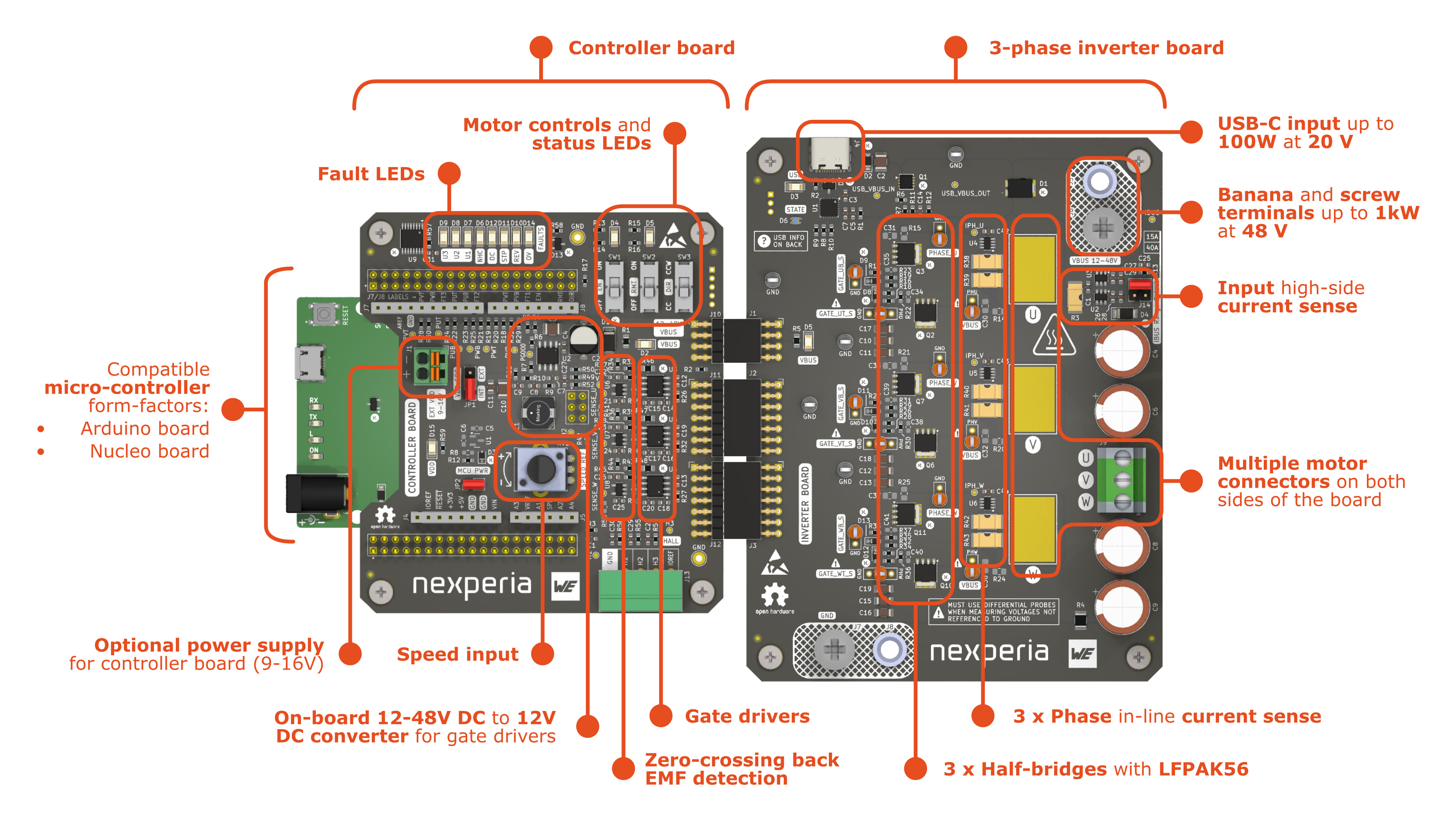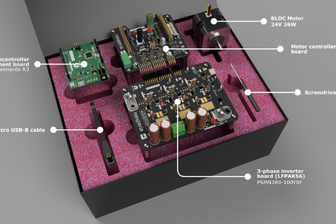 Nexperia's NEVB-MTR1-KIT1 motor driver evaluation kit provides a full motor drive solution for 12 V - 48 V, 1000 W, 3-phase BLDC motors, PMSMs and brushed motors. It contains PCBs designed for the Nexperia LFPAK56 MOSFET family and the modular design allows for different motor controllers, gate drivers, MOSFETs and motors to be used. In addition, each board provides convenient test points for power, motor drive, and sensing signals to aid with development and testing with Nexperia’s LFPAK56 MOSFET family. The motor controller board is designed for the Leonardo R3 and Nucleo development board form factors.