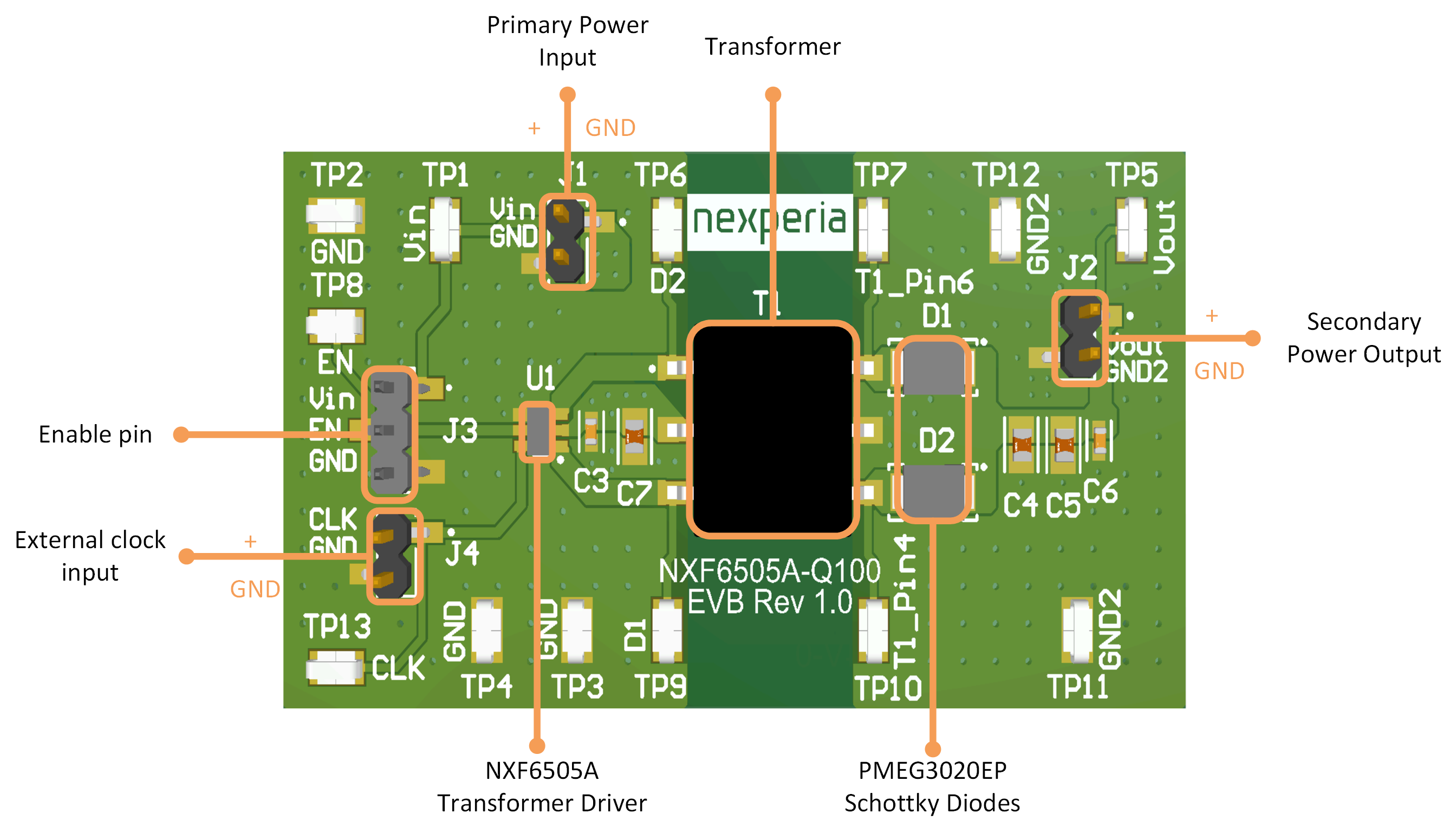 NXF6505A評(píng)估板可用于評(píng)估Nexperia的NXF6505A,后者是用于隔離電源的低噪聲、1.2 A推挽式變壓器驅(qū)動(dòng)器。該EVB可為隔離電源提供一個(gè)正輸出電壓。為便于評(píng)估該EVB,增加了用于測(cè)量電路電壓的測(cè)試點(diǎn)。