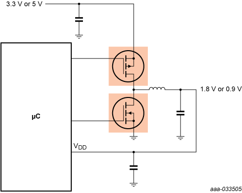 Today’s automotive systems for powertrain application (electronic fuel injection), safety applications (electric power steering, radar system, braking ECU) and body applications are increasingly complex. To meet the processing demands designers are moving to ever more powerful multi-core processors running at 1.8 V or 0.9 V with a switching frequency of 0.4 – 1.8 MHz. While this brings numerous advantages, it also adds strain to ensuring a stable core supply voltage while minimizing on-chip thermals. One approach to solve this is to incorporate a simple discrete P-/N-channel MOSFET buck converter.
