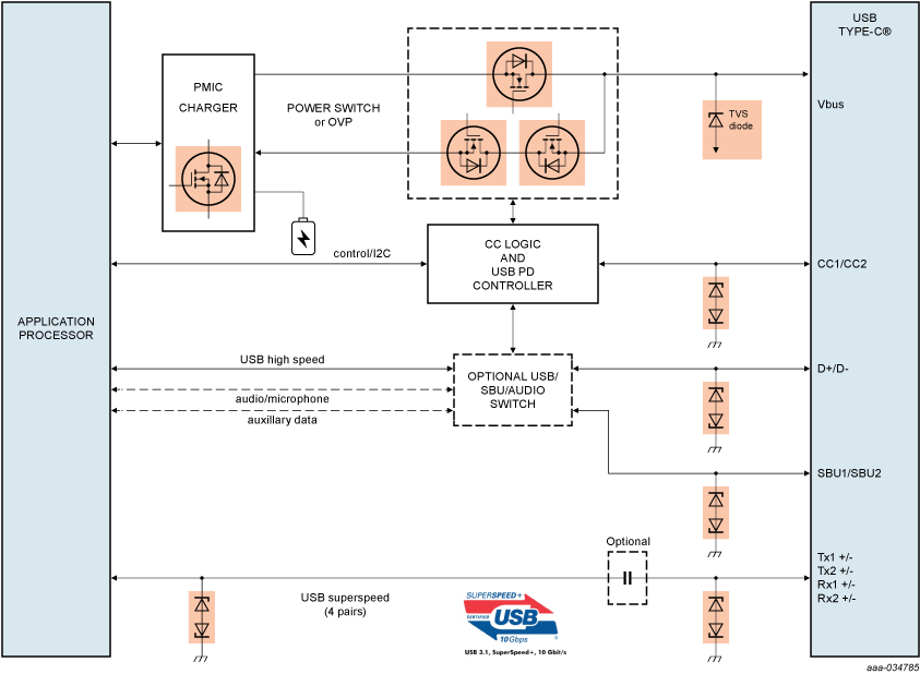 - USB PD via Type-C connectors allows for various power profiles up to 100 W, requires power control switches to be capable of withstanding 20 V or higher
