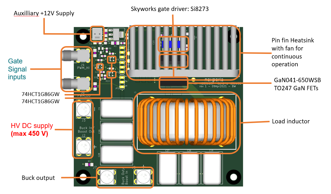 The NX-HB-GAN041UL GAN041-650WSB half-bridge evaluation board provides the elements of a simple buck or boost converter. This enables the switching characteristics and efficiency achievable with Nexperia’s 650 V GaN FETs. The circuit can be configured for synchronous rectification, in either buck or boost mode. Selection jumpers allow the use of a single logic input or separate high side & low side logic inputs. The high-voltage input and output can operate at up to 400 V DC, with a power output of up to 3.5 kW. The inductor provided is intended for efficient operation at 100 kHz, however, other inductors and frequencies may be used.